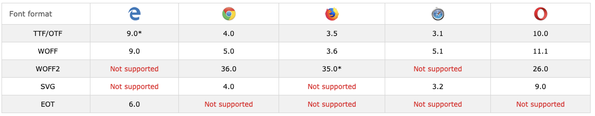 이 중에서 WOFF2, WOFF가 압축률이 좋은데, 기본적으로 폰트를 사용할 때 가장 압축률이 좋은 WOFF2을 쓰고 지원하지 않는 브라우저에서는 WOFF를 쓰면 된다.